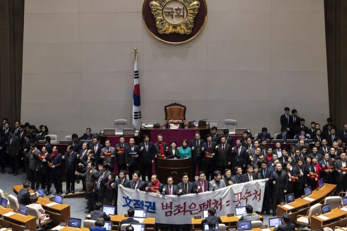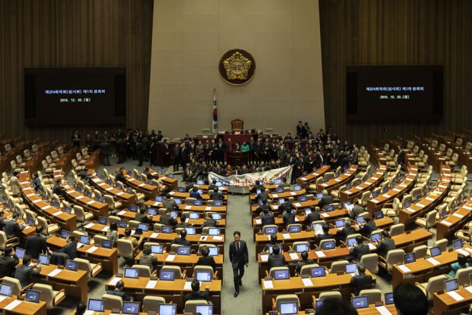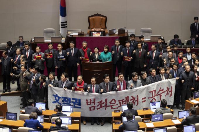 제374회 국회(임시회) 제1차 본회의 개의를 앞둔 30일 오후 서울 여의도 국회 본회의장에서 자유한국당 의원들이 고위공직자범죄수사처 설치 및 운영에 관한 법률안(공수처법) 표결에 반대하는 농성을 하고 있다.