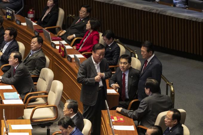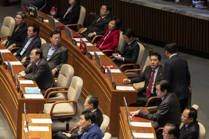 고위공직자범죄수사처 설치 및 운영에 관한 법률안(공수처법) 표결을 앞둔 30일 오후 서울 여의도 국회 본회의장에서 자유한국당 심재철 원내대표(시계방향), 김한표 원내수석부대표, 김무성 의원과 김재원 정책위의장이 대화를 하고 있다.