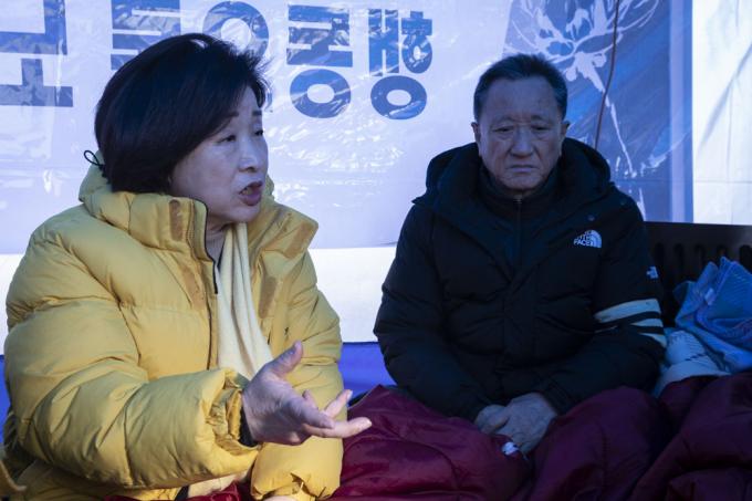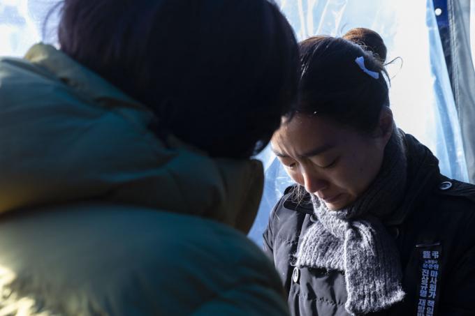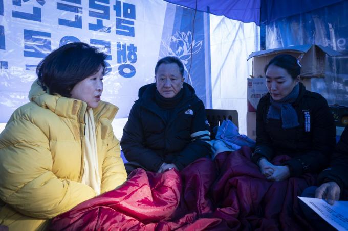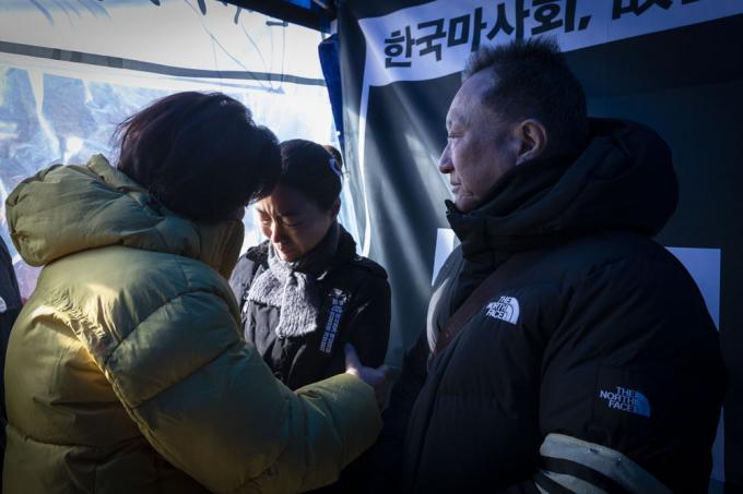정의당 심상정 대표(왼쪽)가 31일 오전 서울 종로구 정부서울청사 앞에 마련된 고(故) 문중원 기수 시민분향소를 찾아 고인의 아내 오은주 씨 손을 잡고 있다.