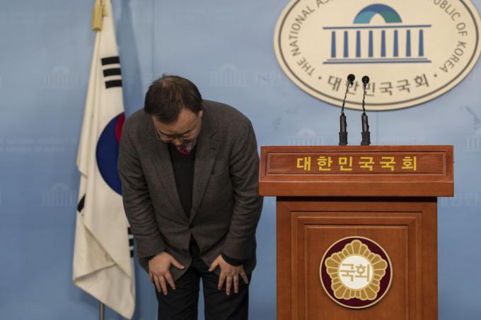 한미 정상 간 통화내용을 언론에 공개해 물의를 빚은 자유한국당 강효상 의원이 2일 오후 서울 여의도 국회 정론관에서 검찰 기소 관련 기자회견에 앞서 허리 숙여 인사하고 있다.