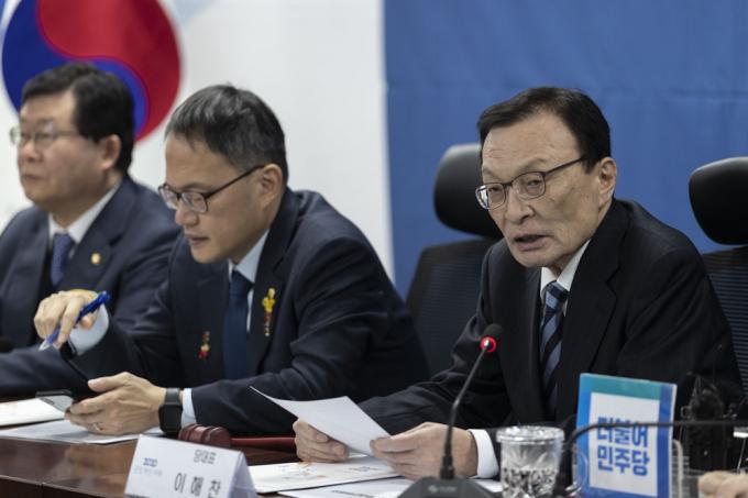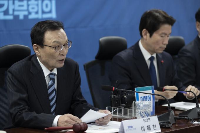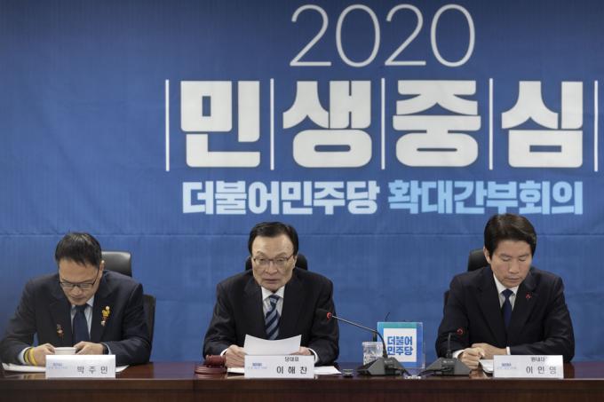 더불어민주당 이해찬 대표(가운데)가 3일 오전 서울 여의도 국회 의원회관에서 열린 당 확대간부회의에 참석해 발언하고 있다.
