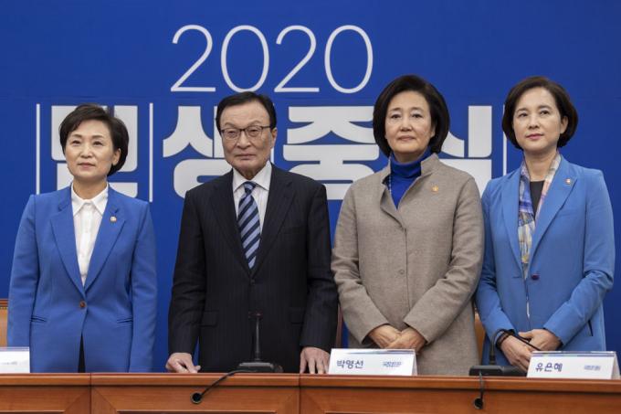 더불어민주당 이해찬 대표와 총선 불출마를 선언한 김현미 국토교통부, 박영선 중소벤처기업부 장관, 유은혜 사회부총리 겸 교육부 장관이 3일 오전 국회 당대표회의실에서 기념촬영을 하고 있다. 왼쪽부터 김 장관, 이 대표, 박 장관, 유 부총리.