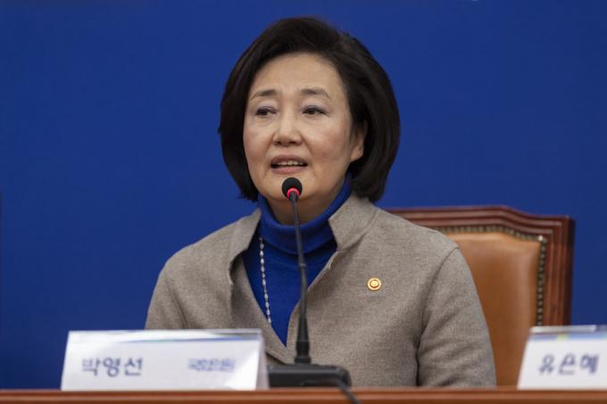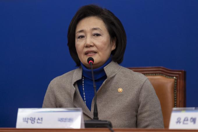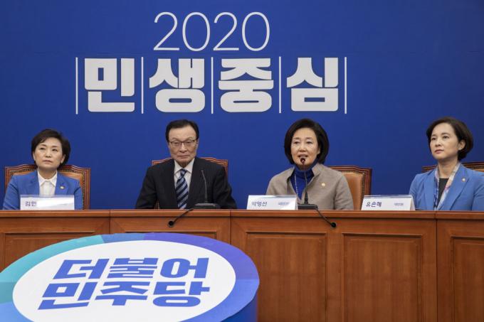 박영선 중소벤처기업부 장관이 3일 오전 서울 여의도 국회 더불어민주당 대표회의실에서 총선불출마 선언을 하고 있다.