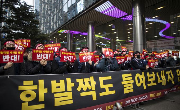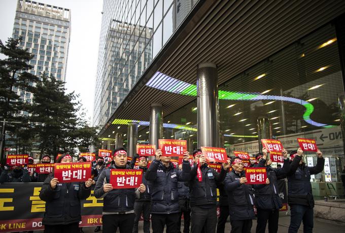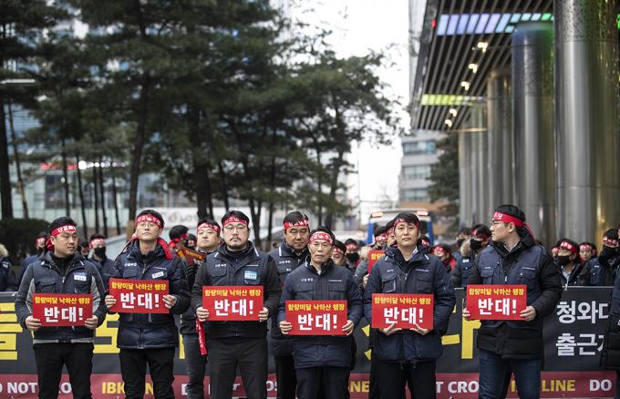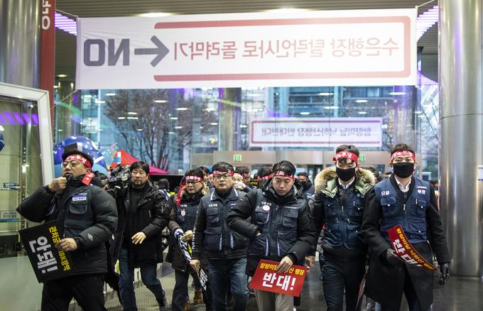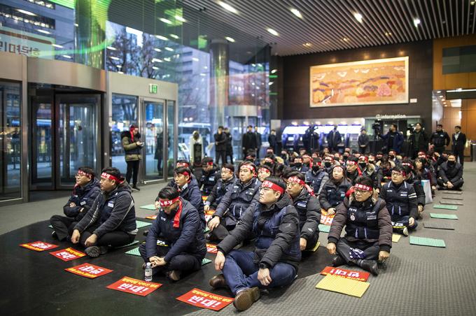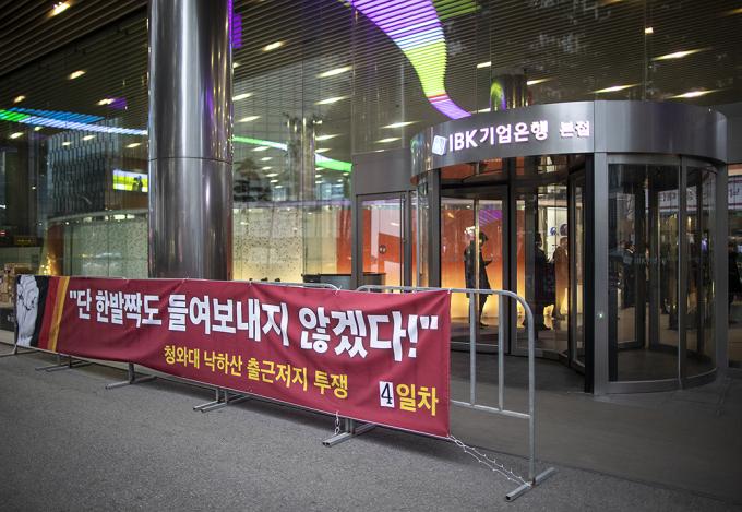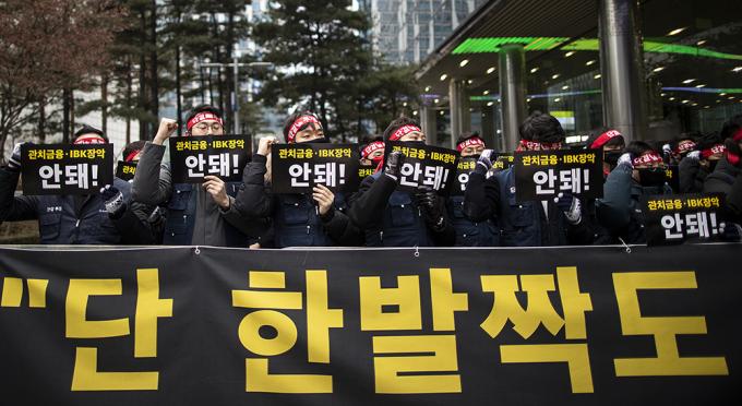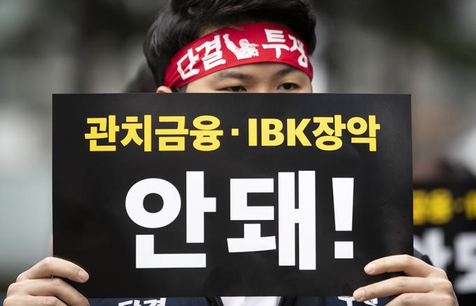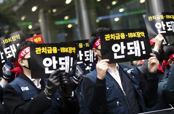 6일 오전 서울 중구 IBK기업은행 본점에서 기업은행 노조가 윤종원 신임 IBK기업은행장 출근저지 투쟁을 하고 있다. 지난 3일 첫 출근에 나선 윤종원 신임 IBK기업은행장은 기업은행 노조원 50여 명의 저지로 출근하지 못했다.