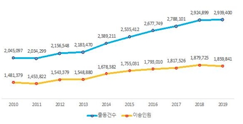 전년도보다 출동 건수는 0.5% 늘었고 이송 인원은 1.1% 줄었다. 2010년과 비교하면 출동 건수는 43.7%, 이송 인원은 25.5% 늘었다.
