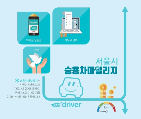 승용차마일리지 가입 대상 차량은 서울시 등록 비영업용 12인승 이하 승용차·승합차다. 서울시 승용차마일리지 홈페이지나 가까운 자치구청, 동주민센터에 방문해 가입하고 실적등록을 할 수 있다.