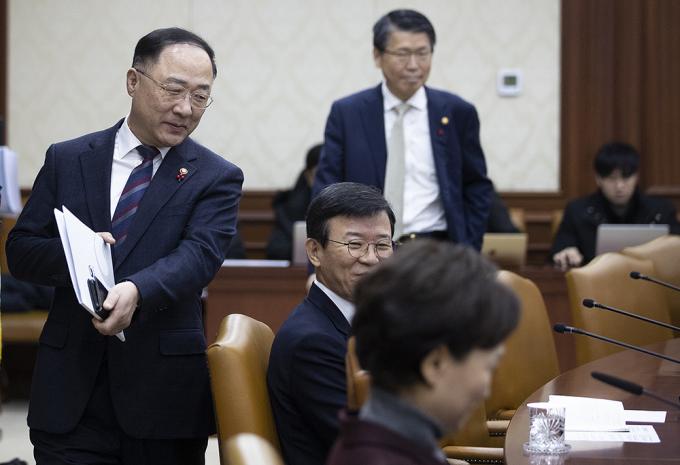홍남기 경제부총리 겸 기획재정부 장관이 10일 오전 서울 종로구 정부서울청사에서 열린 중동상황 관련 관계장관회의에 참석하고 있다.