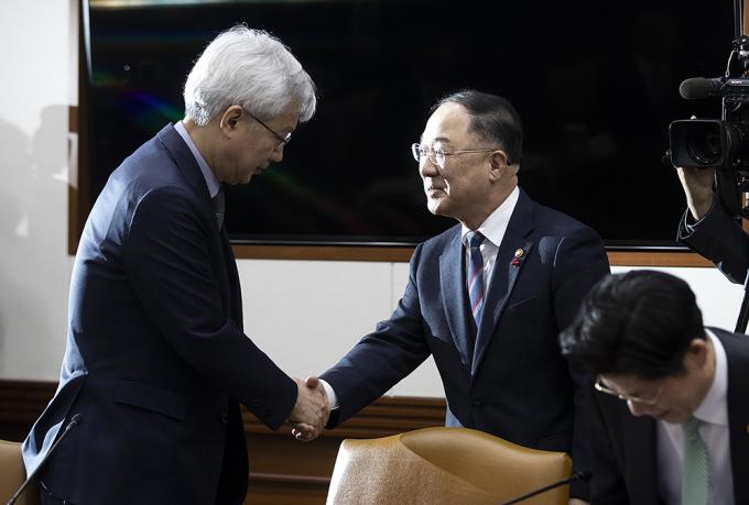 홍남기(오른쪽) 경제부총리 겸 기획재정부 장관이 10일 오전 서울 종로구 정부서울청사에서 열린 중동상황 관련 관계장관회의에서 이태호 외교부 2차관과 악수하고 있다.