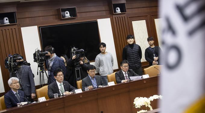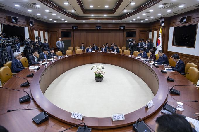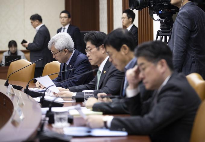 10일 오전 서울 종로구 정부서울청사에서 열린 중동상황 관련 관계장관회의에서 이태호 외교부 2차관, 노형욱 국무조정실장 등 참석자들이 홍남기 경제부총리 겸 기획재정부 장관의 모두발언을 듣고 있다.