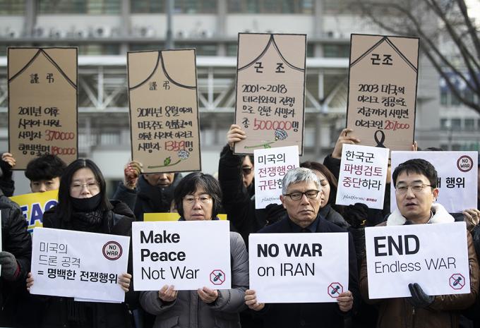 해리스 미국대사 관저 앞 1인 시위도…"해리스 규탄한다" 미국의 솔레이마니 이란 혁명수비대 쿠드스군 사령관 사살과 관련해 100여 개 시민단체는 10일 "미국 정부가 전쟁 행위를 했다"며 "우리 군을 호르무즈 해협에 파병해선 안 된다"고 밝혔다.