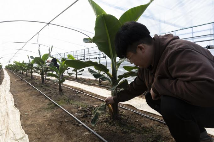 ▲13일 경기도 안성 과수원 비닐하우스에서 청년농업인 김재홍(28세)씨가 손끝바나나 잎을 살펴보고 있다. 김 씨는 "네겹으로 싸여있던 비닐하우스 중 한겹을 벗겨야 겠다"며 "이상기온을 실감하고 있다"고 했다. [문재원 기자]