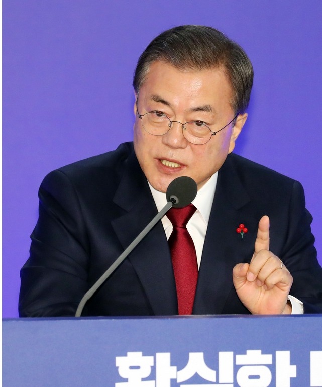 '확실한 변화, 대한민국 2020'이라는 백드롭 아래 자리 잡은 문재인 대통령은 약 2분 정도의 모두 발언을 시작했다.