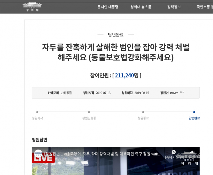 ▲ 자두사건과 관련해 동물보호법 강화를 촉구하는 국민청원은 21만1240건, 항소심 탄원은 6914건에 달한다. [청와대 홈페이지 캡처]