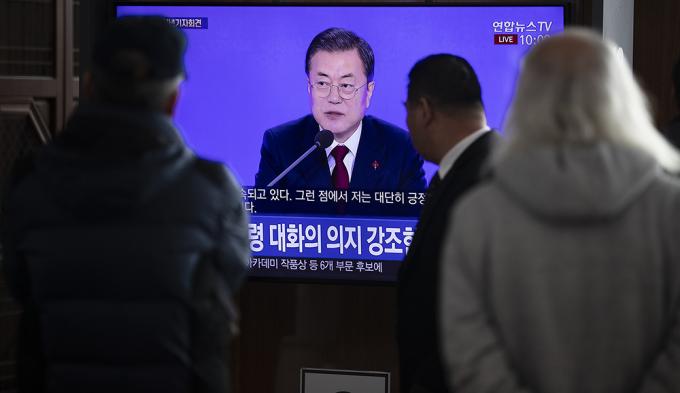 ▲ 서울 용산구 서울역 대합실에서 시민들이 14일 오전 문재인 대통령의 신년 기자회견을 시청하고 있다. [정병혁 기자]