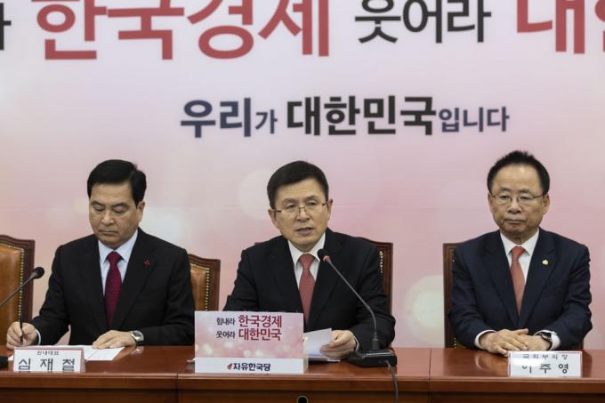 ▲ 자유한국당 황교안 대표(가운데)가 15일 국회에서 열린 당 최고위원회의에 참석해 발언하고 있다.[문재원 기자]