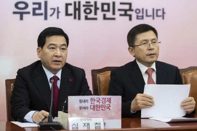 ▲ 자유한국당 심재철 원내대표(왼쪽)가 15일 오전 서울 여의도 국회에서 열린 당 최고위원회의에 참석해 발언하고 있다.[문재원 기자]