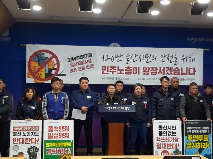민주노총 울산지역본부는 15일 오전 울산시청에서 기자회견을 열고 "8만5,000명의 조합원과 120만 울산시민의 안전을 위해 일방적인 핵폐기물 저장시설 건설을 막아내는 실천투쟁에 나설 것"이라고 밝혔다.