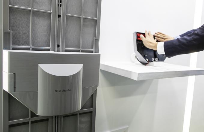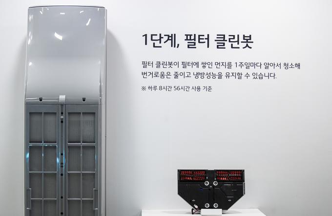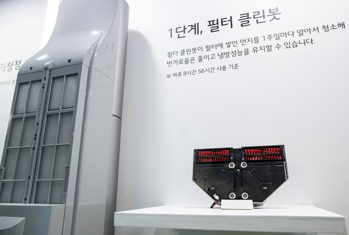 LG전자는 16일 오전 서울 강남구 디자이너클럽에서 '2020년형 LG휘센 씽큐 에어컨 신제품발표회'에서 필터 클릿봇을 공개했다.