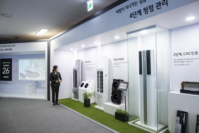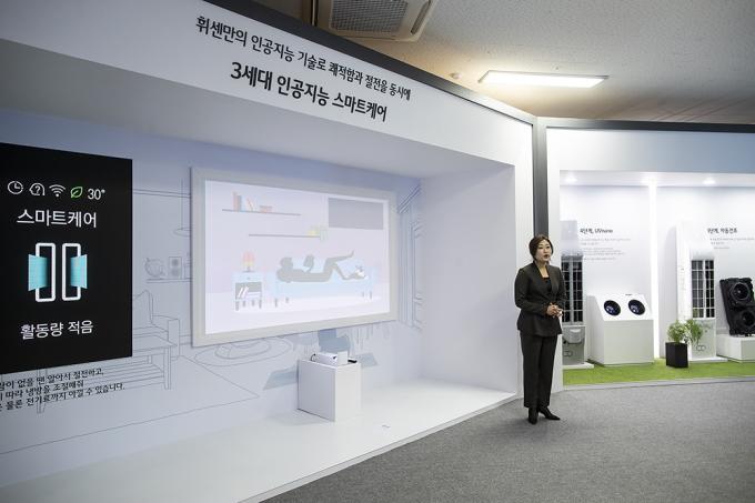 LG전자 관계자가 16일 오전 서울 강남구 디자이너클럽에서 열린 '2020년형 LG휘센 씽큐 에어컨 신제품발표회'에서 에어컨에 탑재된 4단계 청정관리에 대한 설명을 하고 있다.