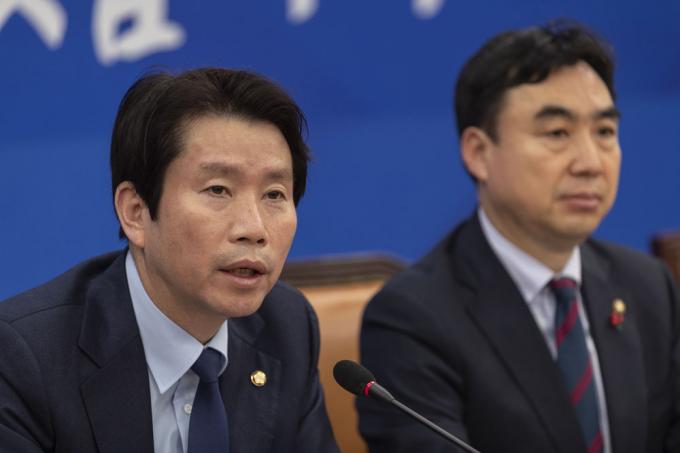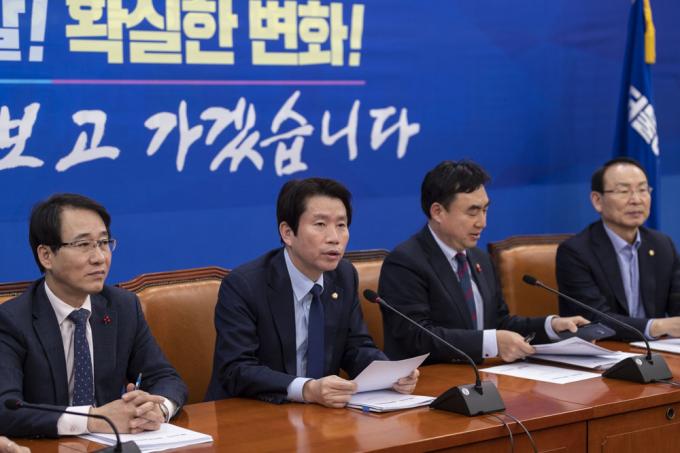 더불어민주당 이인영 원내대표(왼쪽 두번째)가 16일 오전 서울 여의도 국회 당 원내대표 회의실에서 열린 정책조정회의에 참석해 발언하고 있다.