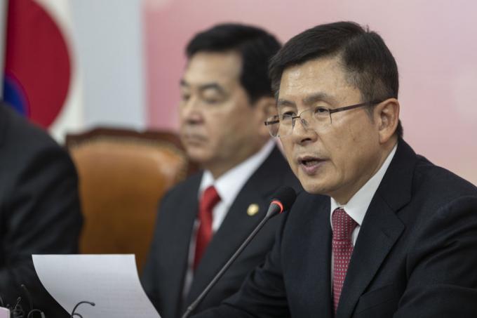 ▲ 자유한국당 황교안 대표(오른쪽)가 16일 오전 서울 여의도 국회에서 열린 당 최고위원회의에 참석해 발언하고 있다. [문재원 기자]
