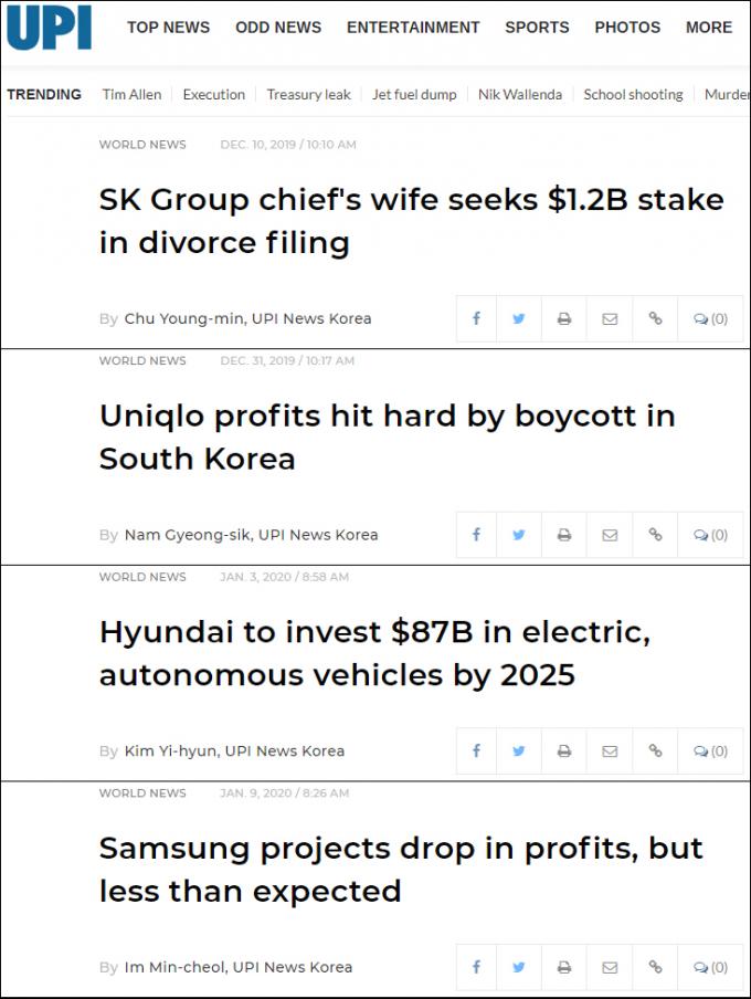지난해 12월부터 최근까지 UPI통신은 최태원 SK회장 부부 이혼소송, 한진그룹 가족 내분, 한국 블록체인 기술 두바이 진출, 유니클로 국내 매출 급락, 현대차 5년 간 전기·자율주행차 집중 개발, 삼성전자 영업이익 하락, 쿠팡의 이베이코리아 매출 추월 등 UPI뉴스의 기사들을 집중적으로 배포했다.