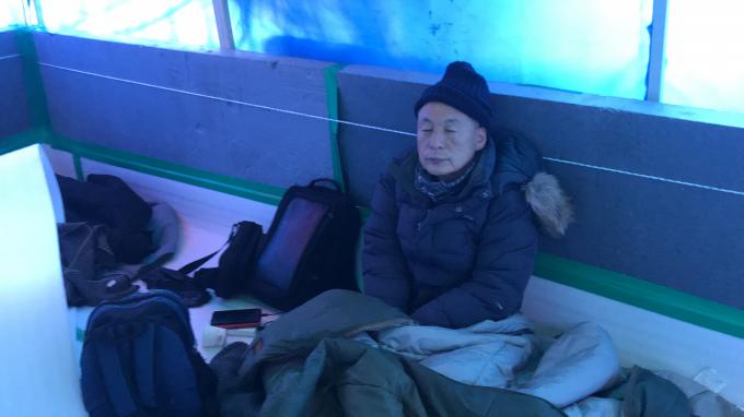 천막 안에는 신기선(61) 씨를 비롯해 3명이 있었다. 밖에 비해 천막 안은 비교적 따뜻했다. 신 씨는 전두환 씨의 구속을 촉구하는 단식을 14일 한 뒤 천막을 계속 지키고 있다.