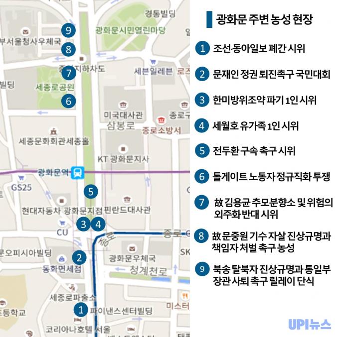▲ UPI뉴스 기자들이 방문한 광화문 천막농성 및 시위 현장 지도 [구글 지도]