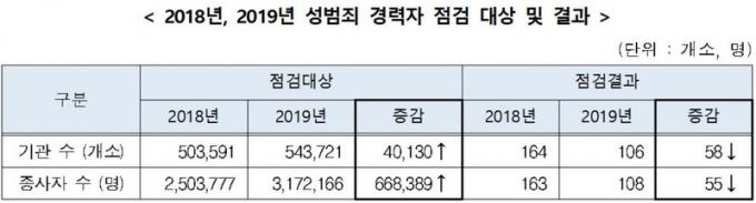 적발된 성범죄 경력자는 사교육시설(30.56%)에 종사한 비율이 가장 높았고, 체육시설(23.15%), 경비업법인(11.12%)이 뒤를 이었다. 올해 점검 대상 기관과 인원은 전년도보다 4만130곳, 66만8389명씩 늘었으나 적발 기관과 인원은 각각 58곳, 55명이 줄었다.
