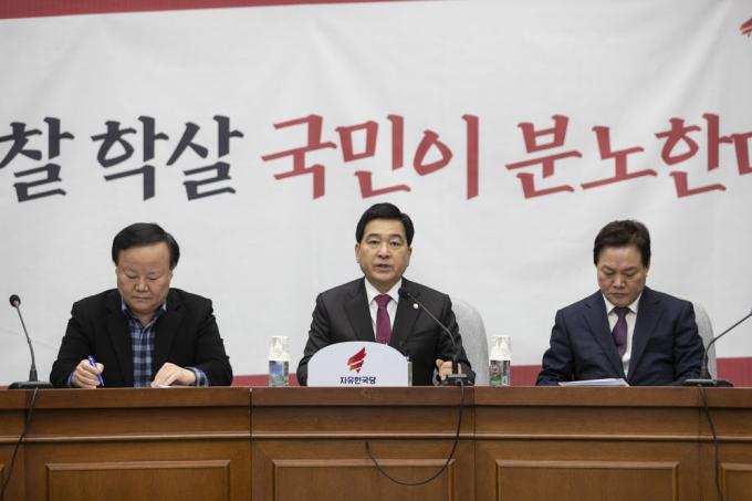 ▲ 자유한국당 심재철 원내대표(가운데)가 17일 오전 서울 여의도 국회 제3회의장에서 열린 당 원내대책회의에 참석해 발언하고 있다.[문재원 기자]