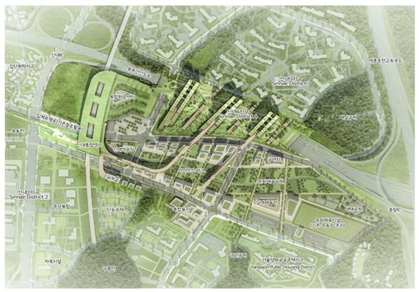 당선작은 도로로 단절됐던 도시공간을 연결하고 주변지역과도 소통하는 열린 도시구조 연결도시를 제안했다.