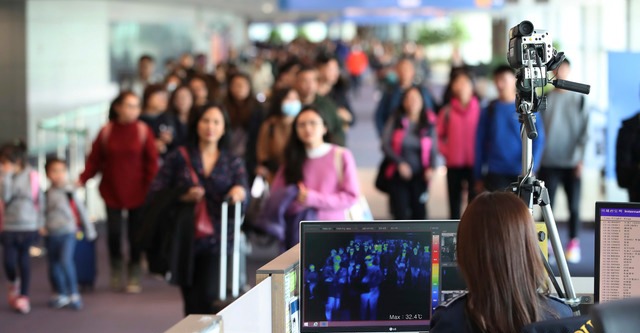 ▲ 지난 9일 인천국제공항 제1여객터미널에서 중국발 항공기 입국자들이 열감지카메라가 설치된 검색대를 통과하고 있다. [뉴시스] 질병관리본부는 20일 오전 우한 신종코로나바이러스 감염증의 해외유입 확진 환자를 확인했으며, 감염병 위기경보 수준을 '관심'에서 '주의' 단계로 격상했다고 밝혔다.