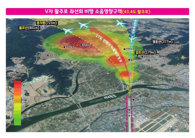 ▲ 김해신공항 V자 활주로 좌선회 비행에 따른 소음영향구역도.  [김정호 국의원실 제공]