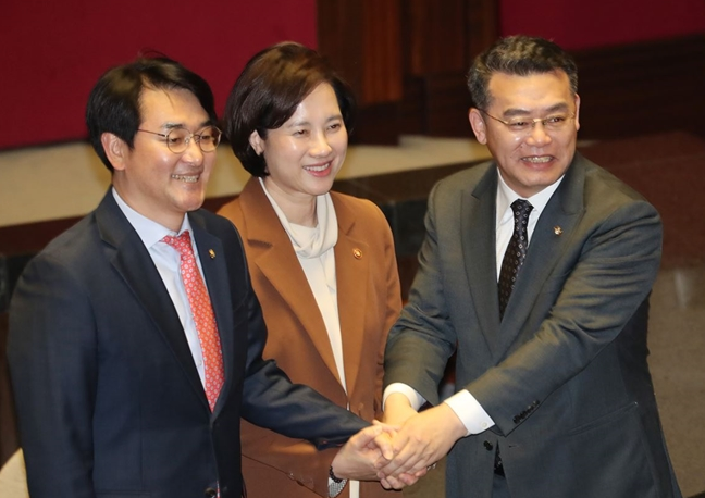 ▲ 유은혜(가운데) 사회부총리 겸 교육부 장관과 박용진(왼쪽) 더불어민주당 의원, 임재훈 바른미래당 의원이 13일 서울 여의도 국회에서 열린 제375회국회(임시회) 제1차 본회의에서 '유치원 3법'이 통과되자 기뻐하고 있다. [뉴시스]