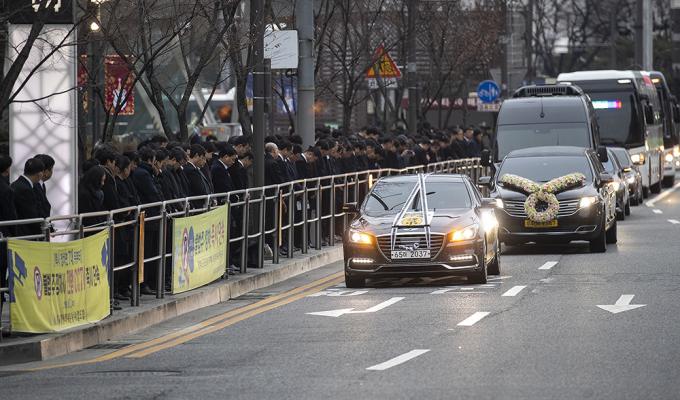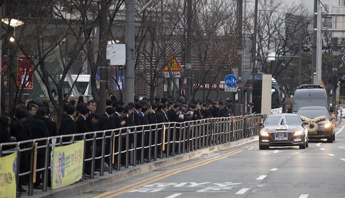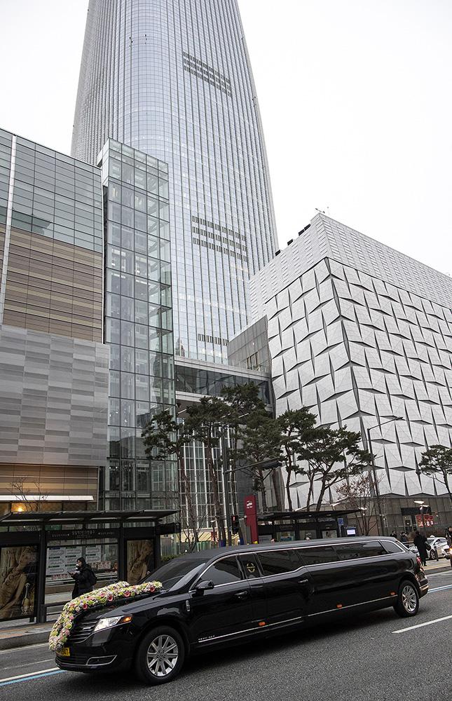 고 신격호 롯데그룹 명예회장의 운구차가 22일 오전 서울 송파구 롯데월드몰 콘서트홀에서 영결식을 마친 뒤 롯데월드타워를 거쳐 장지로 향하고 있다.