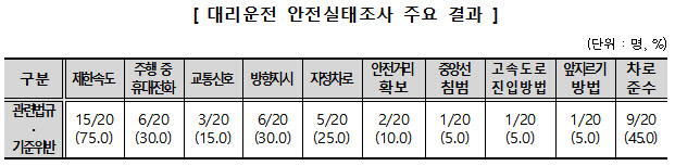 그 결과, 조사대상 대리운전자 20명 가운데 15명은 제한 속도를 10~40km 가량 초과하는 과속 주행을 했다.