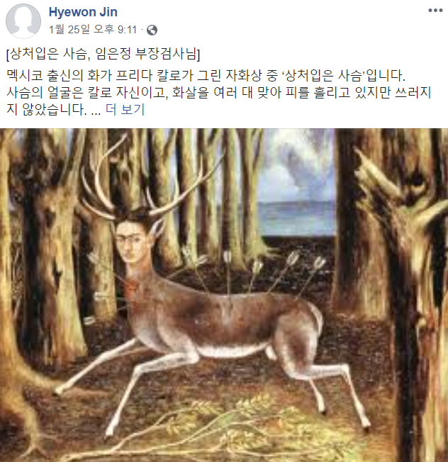 ▲  멕시코 출신 화가 프리다 칼로의 자화상 '상처 입은 사슴'을 소개한 진혜원 검사 페이스북 캡처 사진.