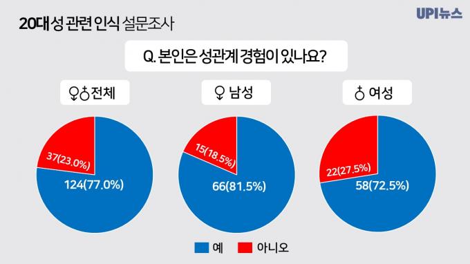 이는 ‹UPI뉴스›가 20대 미혼남녀 161명(남 81명, 여 80명)을 대상으로 실시한 '성 관련 인식조사' 를 분석한 결과다. 조사는 지난달 22~24일 온라인 커뮤니티를 통해 이뤄졌다.