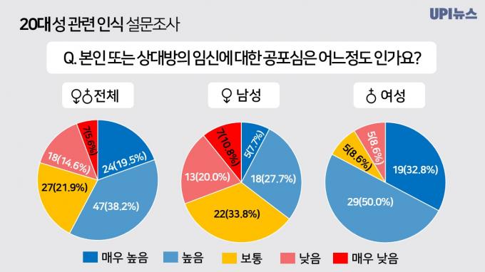 임신공포에 대한 남녀의 응답은 확연히 달랐다. 남성 응답자 중 35.4%만이 임신에 대한 공포감이 높다고 응답한 반면, 여성 응답자는 82.8%가 임신 공포심을 느낀다고 응답했다.