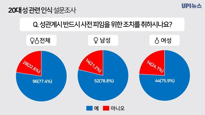 응답자 77.4%는 반드시 사전 피임을 한다고 밝혔다. 남녀 응답 비율은 비슷했다. 22.6%는 사전 피임을 하지 않은 적이 있다고 밝혔다.