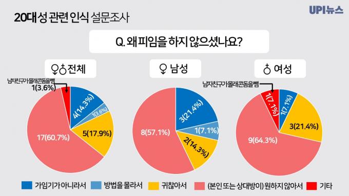 사전 피임을 하지 않는 이유를 물어본 결과 '(본인 또는 상대방이) 원하지 않아서'라는 응답이 60.7%, '귀찮아서'라는 응답이 17.9%, '가임기가 아니라서'라는 응답이 14.3% 순으로 이어졌다. 심지어 성관계 도중 남자친구가 몰래 콘돔을 빼는 이른바 '스텔싱' 행위도 있었다.