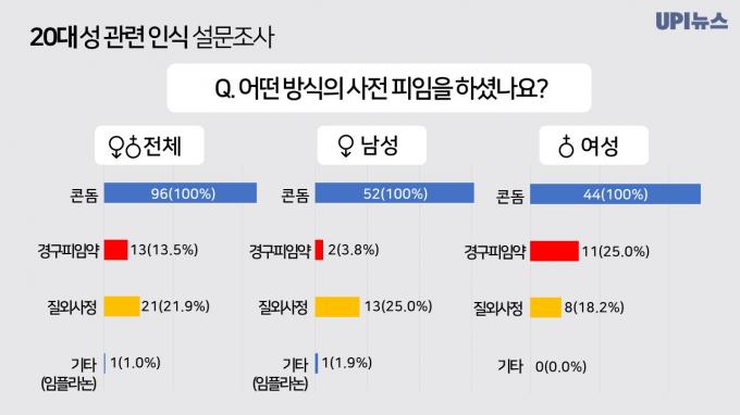 어떤 방식의 사전 피임을 하고 있는지 물어본 결과(중복응답 가능) 모두 콘돔을 활용한다고 답했고 21.9%이 질외사정을, 13.5%이 경구피임약을 이용한다고 답했다. 여성의 팔뚝 등 신체에 피임 기구를 설치하는 '임플라논' 방식을 이용한다는 응답자도 있었다.