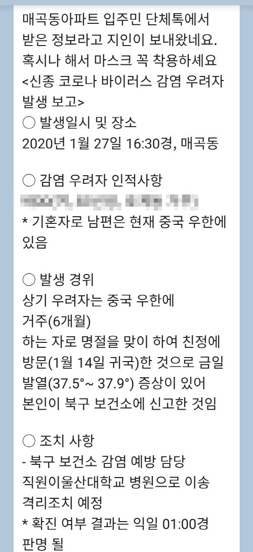 해당 소문은 중국 우한에 거주하던 30대 기혼 여성이 명절을 맞아 친정에 방문했다가 27일 발열 증상이 있어 울산 북구보건소에 신고했다는 내용이 담겼다.