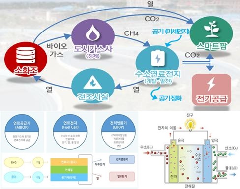 신재생에너지 환상망은 바이오가스를 수소연료전지에 공급해 전기와 열에너지를 생산, 전기는 가정으로 공급하고 열에너지는 슬러지 건조시설이나 도시농업 열원으로 활용한다.
