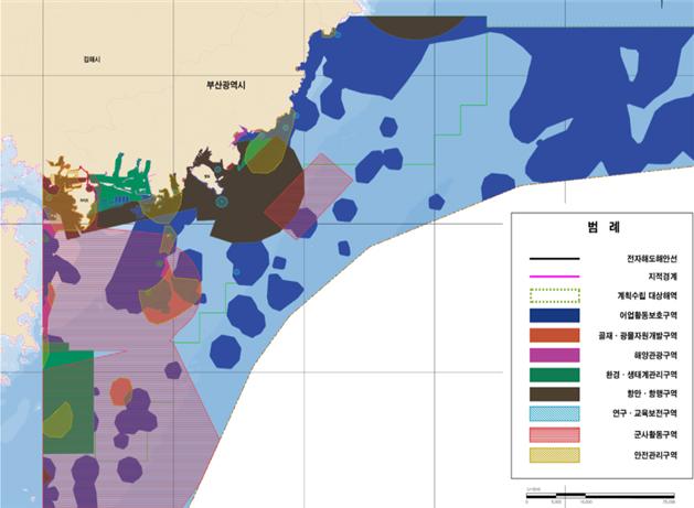 부산권역 해양용도구역은 △어업활동보호구역 △골재광물자원개발구역 △해양관광구역 △환경생태관리구역 △연구교육보전구역 △항만항행구역 △군사활동구역 △안전관리구역 등 8개로 지정됐다.