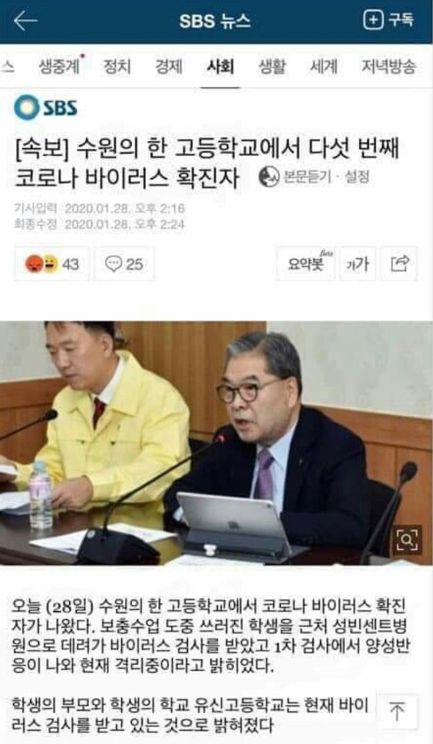 경찰청 사이버안전국은 '[속보] 수원의 한 고등학교에서 다섯 번째 코로나 바이러스 확진자'라는 제목으로 SBS 뉴스를 사칭한 가짜뉴스를 퍼뜨린 사건에 대해 내사중이라고 30일 밝혔다.