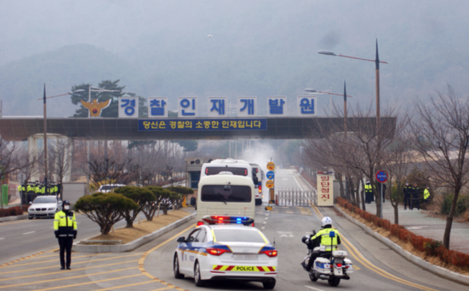 ▲ 중국 우한에서 2차 전세기편을 이용해 귀국한 교민들을 태운 차량이 1일 오전 격리시설인 충남 아산시 경찰인재개발원으로 들어서고 있다. [뉴시스]