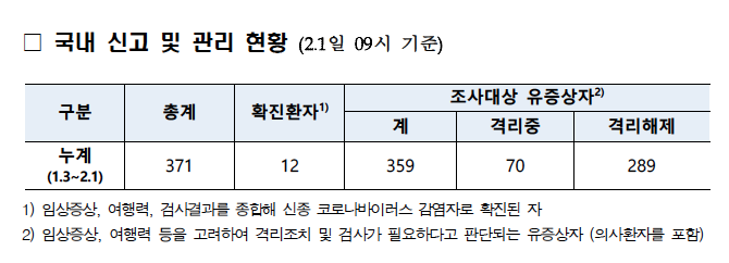 질병관리본부는 1일 오전 9시 기준 총 371명의 조사대상 유증상자에 대한 진단검사를 시행해 이 가운데 289명은 음성으로 격리 해제됐으며 70명은 격리 상태로 검사가 진행 중이라고 밝혔다.
