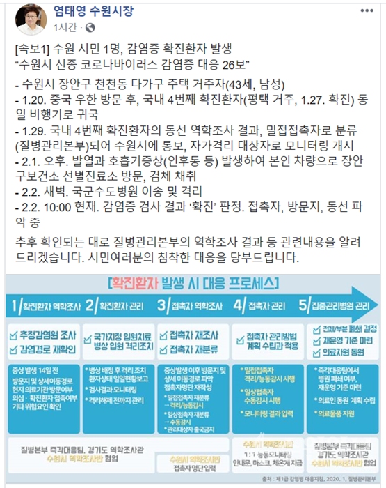염 시장은 "이 남자는 1월 20일 중국 우한 방문 후 국내 4번째 확진 환자(평택시 거주·1월 27일 확진)와 같은 비행기로 귀국해 29일 밀접접촉자로 분류됐으며, 수원시가 자가격리 대상자로 모니터링을 시작했다"고 설명했다.