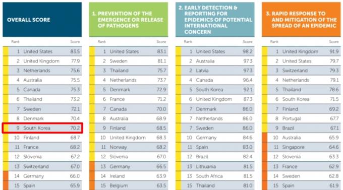 핵위협방지구상(NTI)과 존스홉킨스대학이 합동으로 조사한 '2019년 세계보건안전지수(GHS Index, Global Health Security Index)'에서 우리나라는 9위를 기록했다. 21위를 기록한 일본은 물론이고 프랑스, 스위스, 독일 등의 주요 선진국보다 높았다.